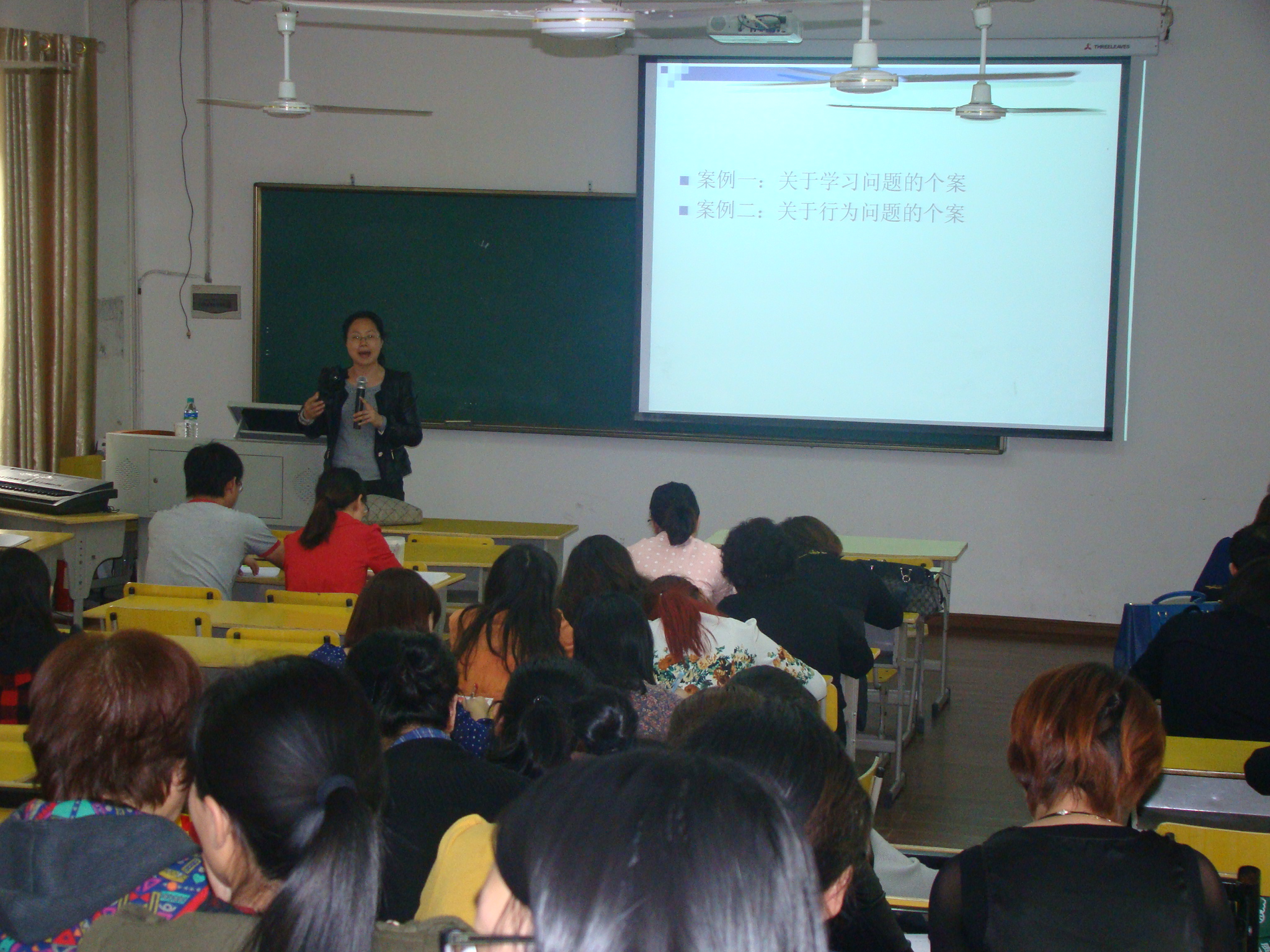 2014年4月15日下午4:00,北京师范大学发展与教育心理学博士、江西省心理协会秘书长、江西师范大学硕士生导师张璟副教授应邀来到江西师大附小,为全体教师开展了一场以小学儿童心理特点及教育方式为主题的专题讲座。讲座由周剑萍书记主持,在周书记对张教授进行了简介并致以欢迎之后张教授从小学生学习问题及行为问题个案入手,介绍了小学生学习的特点、学习障碍、认知能力发展的特点(包括注意力和思维能力)、个性与社会性发展的特点,并针对教师不同的教育方式会带来的效果做了点评,同时也就如何根据小学生的特点进行教育对教师们做出了指导。讲座生动细致,方法科学可行,听众受益匪浅。教师们纷纷表示学习到了如何更好更有效地对学生进行教育,并期望学校能够多开展类似的活动。