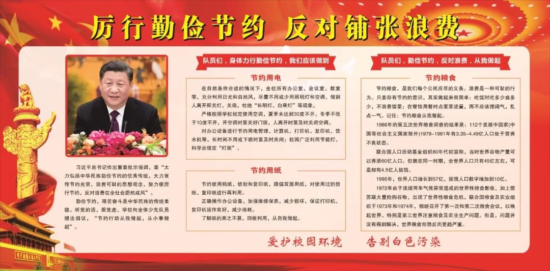 “一粥一饭,当思来处不易;半丝半缕,恒念物力维艰”,近期习近平总书记对制止浪费行为作出重要指示,要求切实培养节约习惯,在全社会营造浪费可耻、节约为荣的氛围。对此,4虎 少先队大队部积极贯彻落实习近平总书记指示,开展了“厉行节约你我同行”为主题的系列活动。