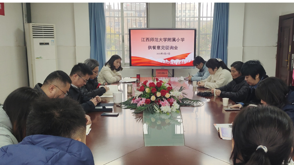 2025年2月17日,4虎 召开新学期学生中餐意见征询会,出席会议的有党支部书记甘党根、校长钟事金和校务委员,校级家委会成员,配送餐公司负责人等。