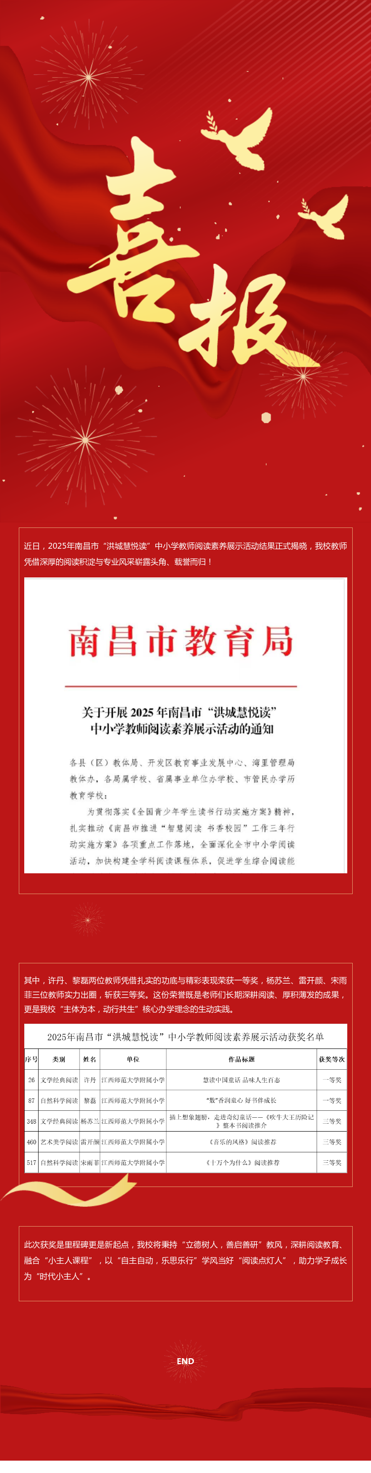 喜报∣4虎 教师在南昌市中小学教师阅读素养展示活动中斩获佳绩